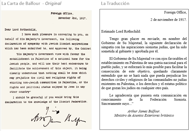 Los usurpadores entregan lo que no les pertenece a quienes no les corresponde. Ésta siempre ha sido la tónica de las potencias colonialistas. La Declaración Balfour era una carta fechada el 2 de noviembre de 1917 del Secretario de Relaciones Exteriores del Reino Unido, Arthur James Balfour, a Walter Rothschild, segundo barón Rothschild, líder de la comunidad judía británica, para su transmisión a la Federación Sionista de Gran Bretaña e Irlanda.