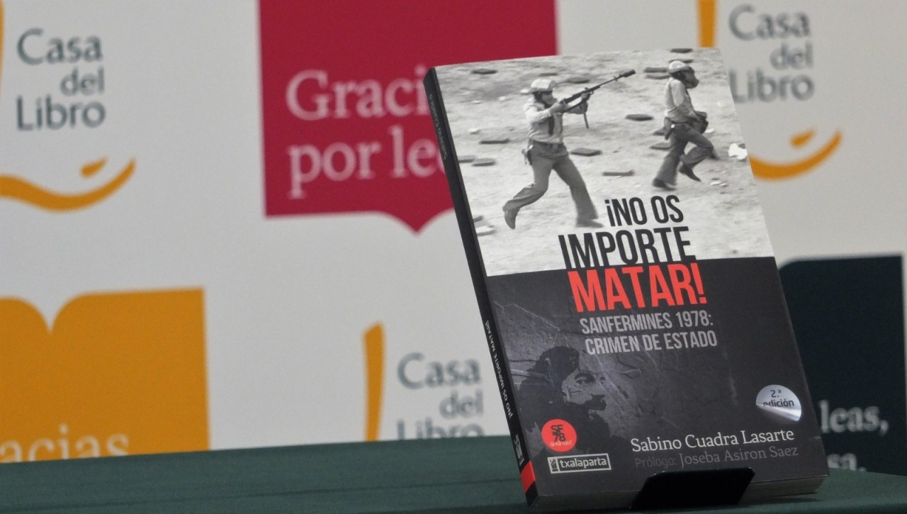 Los apoyos son absolutamente sociales y ciudadanos, los esenciales que hemos tenido para poder hacer este libro, en parte este libro es una recopilación de trabajos ya realizados en otras instancias y después investigaciones que hemos podido realizar como grupo, un material muy importante fue el propio informe Sanfermines que hicieron las peñas sanfermineras en 1978, en agosto, previo trabajo de investigación, realizado a pie de calle, tomando declaración a centenares de personas, y que fue publicado en agosto de 1978. Después ha habido distintos documentales realizados por personas, tanto de Iruña como de Madrid, investigaciones realizadas por historiadores, periodistas, y documentación que nosotros pudimos conseguir por nuestra cuenta, también tomando declaraciones a la gente, consiguiendo finalmente, tras cuarenta años de ocultamiento y negación, lo que nosotros llamamos el informe Martín Villa, es decir, el informe realizado en aquellos días por las más altas instancias policiales y que pone de manifiesto, en alguna medida, presenta contradicciones substanciales en relación con lo que ha sido la verdad que han difundido. Con todo esto hemos podido realizar este trabajo.