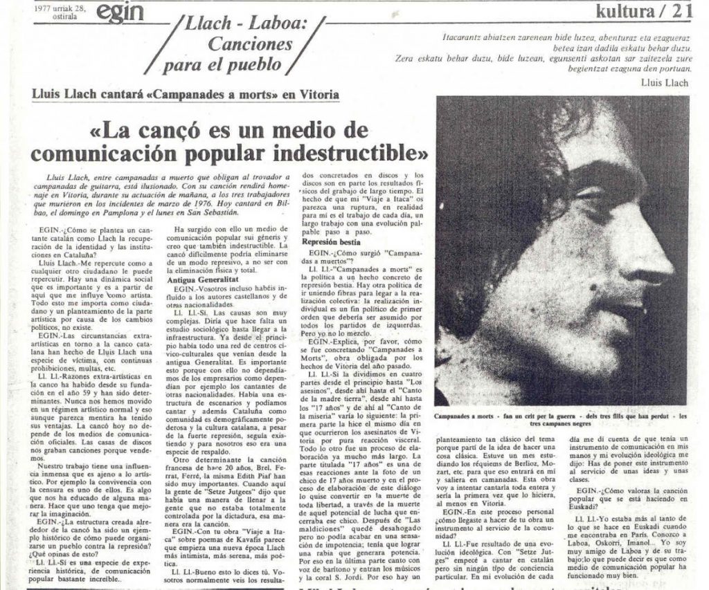 En 1977 Lluis Llach hizo una gira con Mikel Laboa presentando “Campanades a Morts” en Euskal Herria, fue la primera vez que la interpretó en Gasteiz. Ese concierto en Mendizorrotza se convirtió en un homenaje multitudinario a las víctimas de la matanza ocurrida año y medio antes.