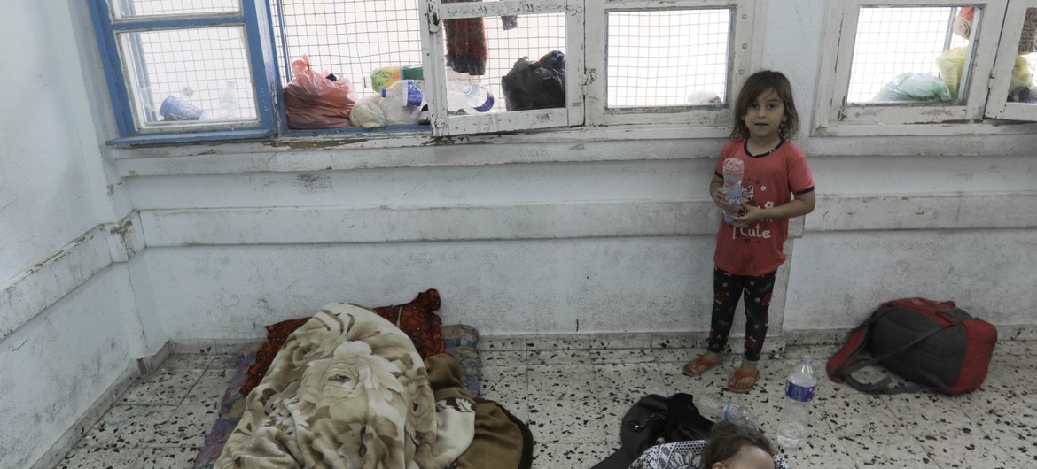 © 2021 UNRWA/Mohamed Hinnawi Una niña mira a sus hermanos dormir en el piso de un aula de una escuela de la UNRWA en Gaza