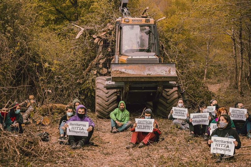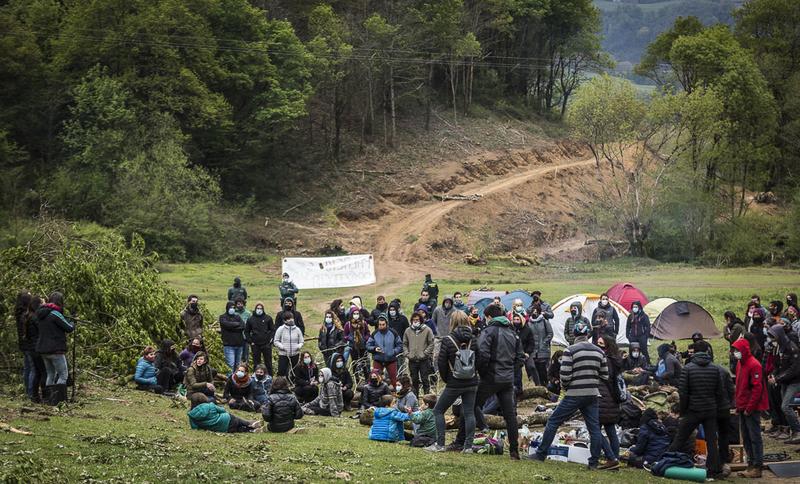 Garbiñe es vecina de Lekaroz. Ella también tiene amigas y juntas llevan acampadas desde el viernes 16 de abril en la zona donde han empezado las obras de construcción del proyecto Aroztegia. No tienen intención de moverse hasta paralizar las obras completamente. De momento, han parado el uso de las motosierras que talaron los primeros árboles, la entrada de los camiones que se llevaron la leña y han impedido que la empresa adjudicataria de las obras construya un puente para que las máquinas crucen el río.