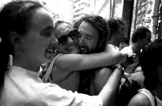 Recibimiento en la puerta de la cárcel de Iruñea a los ocho autores de la acción tras su puesta en libertad condicional en junio de 1996. En la imagen, Txomin Yubero.