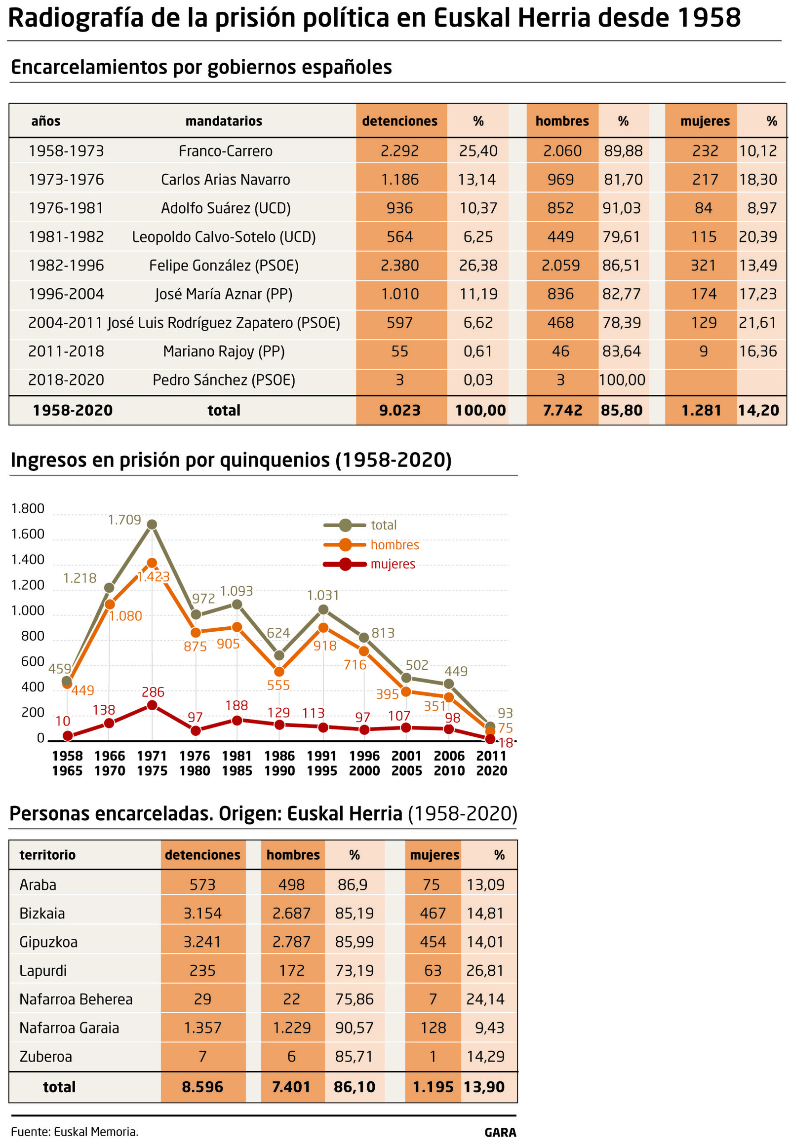 La fundación Euskal Memoria ha dedicado su monográfico de 2020 a analizar la prisión política en Euskal Herria. Inicialmente se planteaba como recopilatorio de quienes la han sufrido o aún sufren desde 1958 hasta la actualidad: nombres y apellidos, lugar de nacimiento, fecha de encarcelamiento, fotografías... En la primera edición ya publicada se identifica a 9.023, lo que de entrada es una noticia de alcance. Pero, además, cruzando datos de ese listado han salido conclusiones relevantes, un estudio en toda regla.