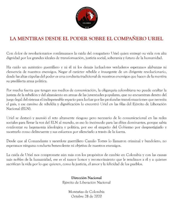 Pocos días después de los entusiastas anuncios de los representantes del Estado colombiano, el jueves (29) sale a la luz pública la nota del ELN en honor al comandante Uriel, “quien entregó su vida con alta dignidad a los grandes ideales de transformación, justicia social, soberanía y futuro de la humanidad”.