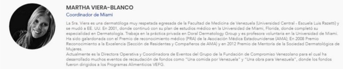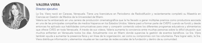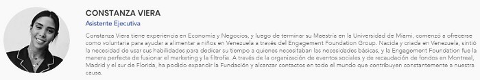 La organización Engagement Foundation Group declara recibir donaciones y financiamientos de particulares interesados en proveer de insumos, alimentos y materiales médicos en Venezuela. Aunque afirma tener 500 voluntarios con los que ha desplegado “ayuda humanitaria” a migrantes y refugiados de varios países, incluida Venezuela. Sin embargo, su registro de actividades es más bien reducido. La directiva de la organización está en manos de Valeria Viera (directora ejecutiva), Constanza Viera (ejecutiva asistente) y Marta Viera-Blanco, familiares del nombrado ilegalmente como embajador en Canadá, Orlando Viera-Blanco.