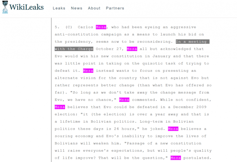 El memo destacaba que Mesa se había reunido con el encargado de negocios de la embajada estadounidense, diciéndole en privado que planeaba lanzarse a la presidencia. Recuerda el cable: "Mesa nos dijo que su partido es ideológicamente similar a una formación socialdemócrata y que tenía la esperanza de fortalecer lazos con el Partido Demócrata. 'No tenemos nada en contra del Partido Republicano, y de hecho en el pasado hemos recibido apoyo del Instituto Internacional Republicano (IRI, por sus siglas en inglés), pero creemos que compartimos más ideología con los Demócratas'", agregó.