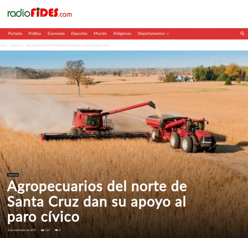 Camacho radicalizó la medida y dijo que el paro sería de carácter indefinido con el respaldo del llamado Comité Nacional de Defensa de la Democracia (Conade) y otras plataformas a nivel nacional. La voz de fraude era letanía en los medios bolivianos e internacionales y el 2 de noviembre, en medio de una movilización, Camacho exigió la renuncia inmediata de Morales. El libreto que utilizaba se parecía al aplicado por la derecha venezolana contra Hugo Chávez a finales de 2003 durante el paro petrolero.