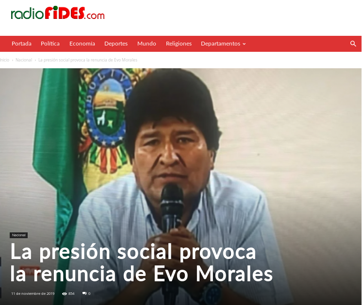 Los titulares de medios como Erbol, La Patria, Página Siete, que ya venían llamando "crisis" a la escalada violenta coordinada por la oposición, apodaban de "renuncia" a un hecho forzado por la violencia generada y la guerra civil en ciernes. La coordinación de dichos medios con funcionarios del Grupo de Lima fue total.