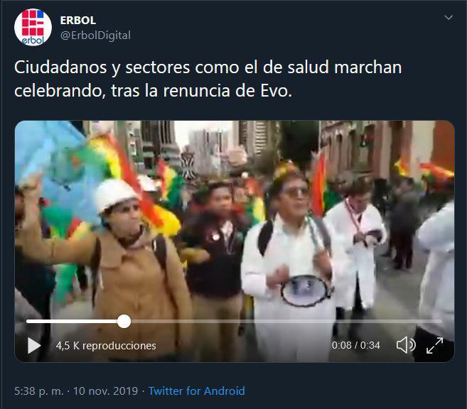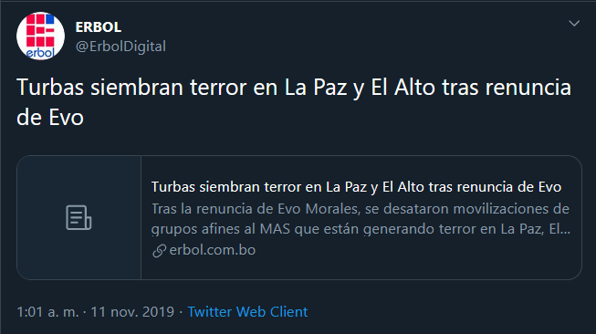 A continuación la prensa comprometida con el golpe tildó de "turbas" a los grupos que se manifestaron en contra de la violencia generada por la oposición boliviana y de la salida de Morales del poder mientras llamaban "ciudadanos" a quienes celebraban el golpe.