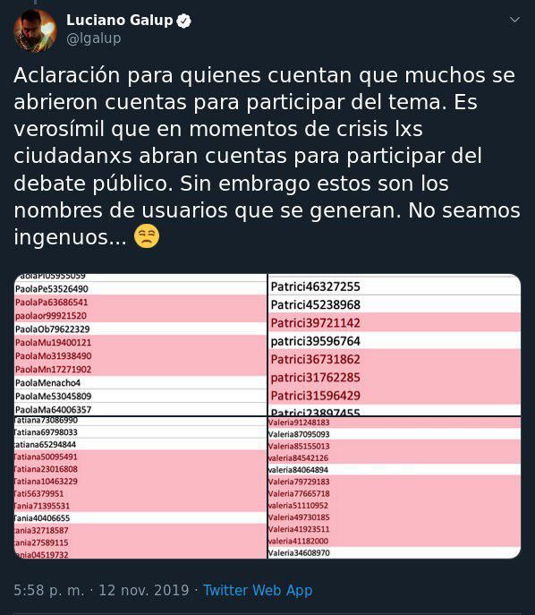 Por otra parte, Luciano Galup, especialista en comunicación política, escritor del libro Big Data y Política y director de la consultora Menta Comunicación, afirma en su cuenta twitter @lgalup que al menos 800 cuentas de las que participaron en el hashtag o etiqueta #BoliviaNoHayGolpe tenían 0 (cero) seguidores y 3 mil 612 cuentas tienen entre cero y un seguidor. Además hay 4 mil 492 cuentas que se crearon entre el 11 y 12 de noviembre solo para participar de la etiqueta.