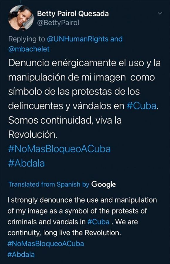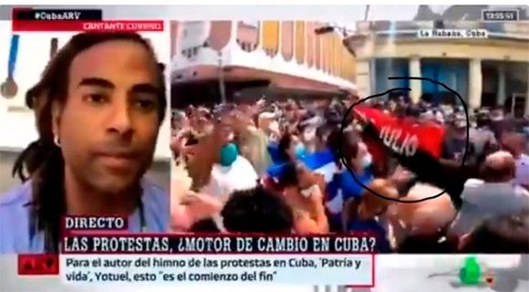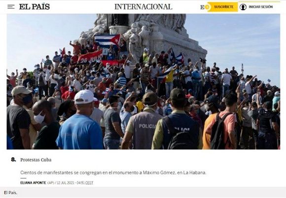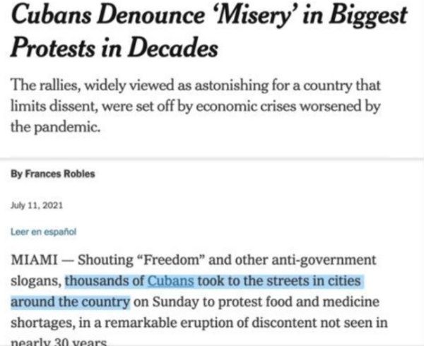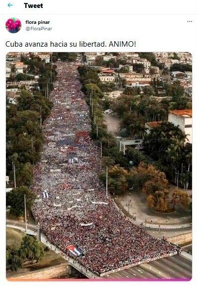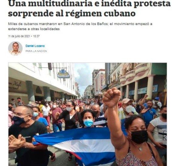 Porque una de las falsedades más espectaculares fue la de incluir imágenes de manifestaciones de apoyo al Gobierno y a la revolución como manifestaciones de protesta contra el Gobierno. Sobre ellas, el diario La Nación, de Argentina, titula a gran tamaño “Una multitudinaria e inédita protesta en las calles sorprende al régimen cubano”, pero la imagen que incluye es de una manifestación de apoyo, eso sí, con un pie en letra pequeña que dice “Defensores del régimen salieron a marchar después de un llamado del presidente Miguel Díaz-Canel”.