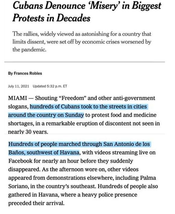 Sorprende la atención que han recibido en los medios las manifestaciones en Cuba mientras esos mismos medios han pasado de puntillas sobre el asesinato a tiros del presidente de Haití, o han callado ante la represión en Colombia con 63 personas asesinadas en dos meses. Sin ir más lejos, ese mismo fin de semana murieron 72 personas por disturbios en Sudáfrica. Si hasta ha ocupado Cuba más que las noticias sobre el enriquecimiento de Juan Carlos de Borbón con la venta de armamento.
