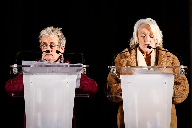 Las víctimas de terrorismo Rosa Rodero, viuda del ertzaintza Joseba Goikoetxea, asesinado por ETA, y Axun Lasa, hermana de José Antonio Lasa, asesinado por el GAL, portaron la pancarta de la manifestación en Bilbao y leyeron juntas el discurso final en la explanada del Ayuntamiento.