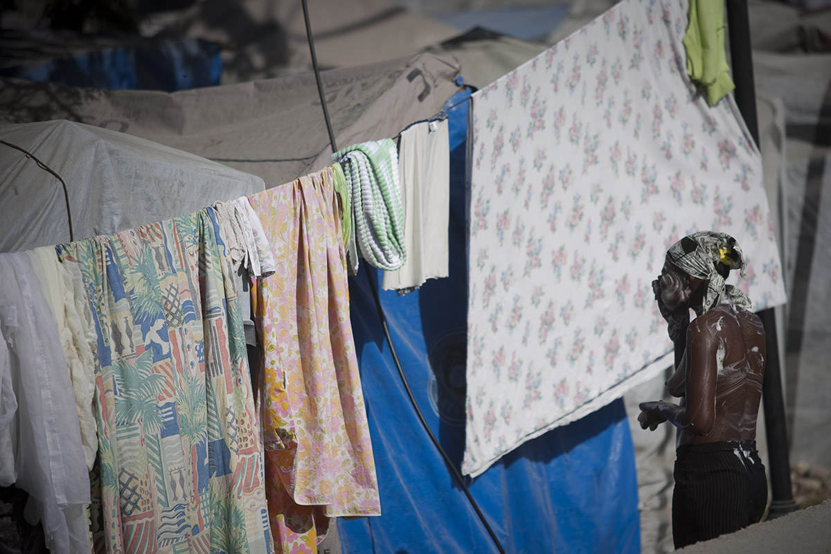 Una mujer se lava la cara en un campamento en Puerto Príncipe. Foto: Alejandro Saldívar