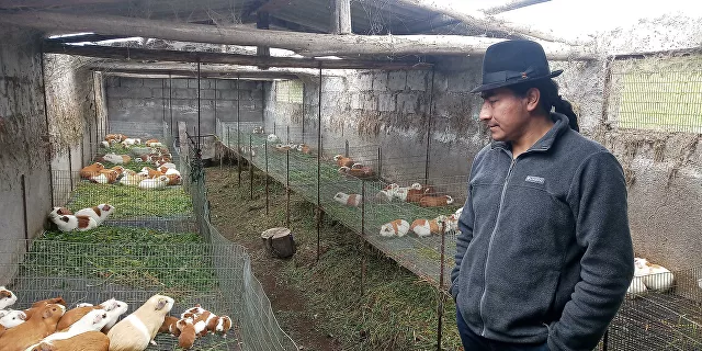 Leonidas Iza en su criadero de cuyes en San Ignacio